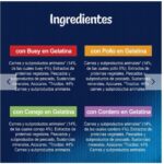 Es una comida húmeda completa y equilibrada para gatos que viene en un pack que contiene 12 sobres: