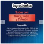 Carne y subproductos animales (35% del cual un 50% es rehidratado con un contenido de carne mínimo de 26%, 0,5% de carne de vacuno, 0,5% de pollo), cereales, aceites y grasas, extractos de proteínas vegetales, minerales, azúcar, levadura, pescado y subproductos de pescado (1% del cual un 2% es rehidratado con 0,5% salmón).