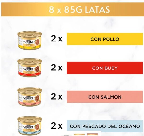 El pack Gourmet Gold Delicias suculentas surtido de pescados y carnes te ofrece 8 latas de 85g cada una con 4 recetas diferentes para que tu gato disfrute de los sabores de la gama. Son un alimento húmedo de alta calidad que cuida la salud de tu mascota día a día.