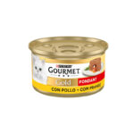 Gourmet Gold Fondant es una nueva variedad de alimento húmedo para gatos que se caracteriza por su nueva forma y textura. Se trata de un exquisito y suave paté con pollo que, en su interior, guarda un sorprendente corazón líquido. Tu gato disfrutará mordiendo el mousse exterior y encontrando la increíble salsa líquida del interior. ¡Se convertirá en su plato favorito!