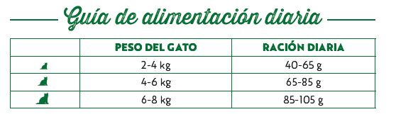 Cereales (cebada integral 4%, maíz entero 4%), carnes y subproductos animales, pescados y subproductos de pescado (proteínas deshidratadas de salmón 10%), extractos de proteínas vegetales, aceites y grasas, subproductos de origen vegetal, verduras (guisantes deshidratados 4%, zanahorias deshidratadas 0,5%, equivalente a un 4% de zanahorias frescas), sustancias minerales, frutas (manzana deshidratada 0,3%, equivalente a un 2% de manzana fresca), romero deshidratado 0,01%, albahaca deshidratada 0,01%.