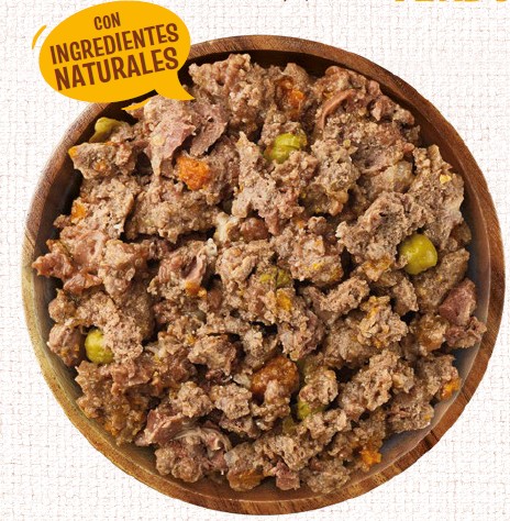 La receta se apoya en el pollo y se completa con cerdo y buey, logrando un perfil de sabor potente y muy atractivo. Además de guisantes y zanahorias.