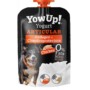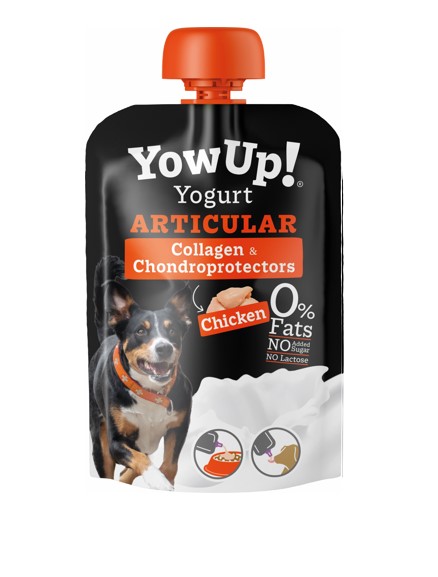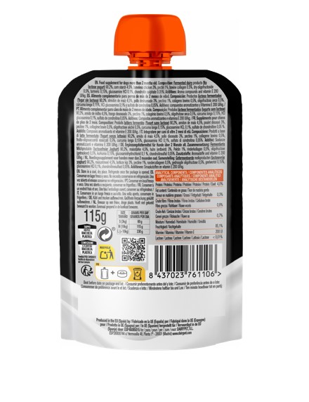 Productos lácteos fermentados (Yogur sin lactosa) 90%, almidón de maíz, pollo deshuesado 3%, pectina 1%, colágeno bovino 0,5%, oligofructosa seca 0,5%, cúrcuma 0.15%, HCl glucosamina 0,1%, sulfato de condroitina,