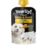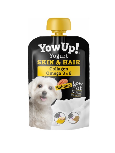 Productos lácteos fermentados (Yogur sin lactosa) 87%, almidón de maíz 3,5%, aceite de pescado 3,5%, salmón 3%, pectina 1%, colágeno bovino 0,5%, oligofructosa seca 0,5% y cúrcuma longa 0,01%.